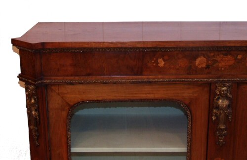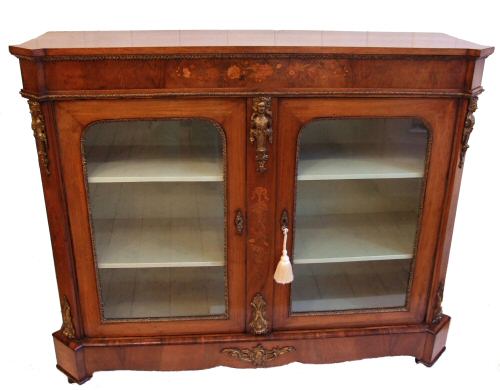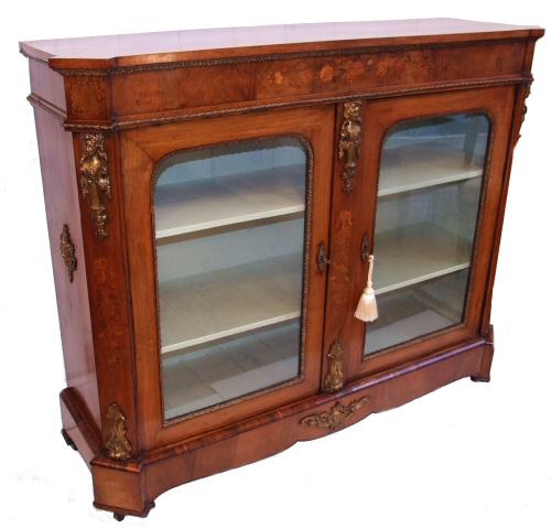 Victorian Walnut Double Pier Cabinet Circa mid 19th Century a beautiful Victorian Walnut side or Pier Cabinet. This two door example in figured walnut features excellent foliate marquetry inlay to the frieze, canted corners and the panel between the doors. The marquetry is especially good being in several colour tones including greens. Further embellishments take the form of ormolu classical maidens with foliate mounts and key escutions.Very capacious, with beautiful soft apple green silk interior having been relined. Presented in beautiful original condition, this is a wonderful example of a large antique Victorian Pier Cabinet.