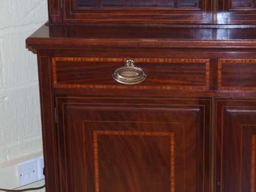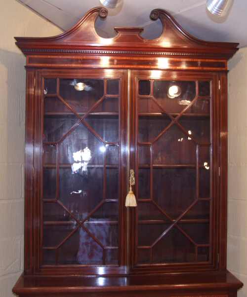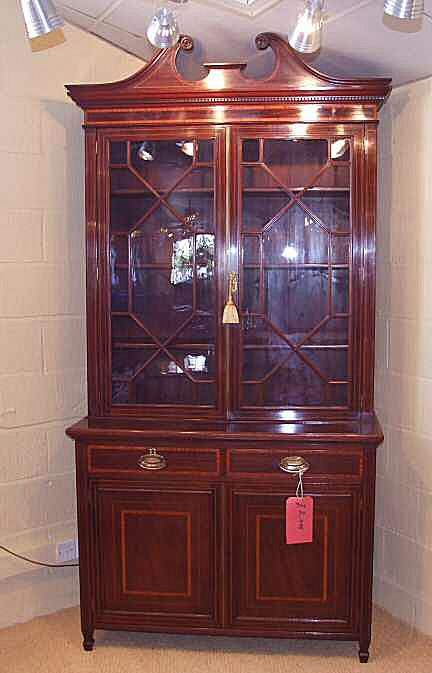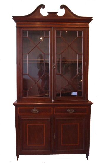 Edwardian Inlaid Mahogany Bookcase in the 18th Century style Circa 1900 a beautiful Edwardian inlaid mahogany bookcase of fine quality. This lovely example is a deep rich colour banded with satinwood to the whole body. Standing on short tapering spade feet it comprises of a 2 door cupboard section with shelf within, above are 2 frieze drawers each with beautiful oval brass drop handles. Above is a 2 door astragal glazed bookcase section wth 3 fully height adjustable shelves. The original glass held within fine astragal glazing and central brass door covering strip. The whole surmounted by a dental cornice and swan neck pediment with lotus leaf rosettes. Very original and imposing. Depth 20" £2495 (Ref:ST92)