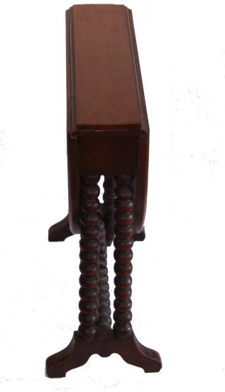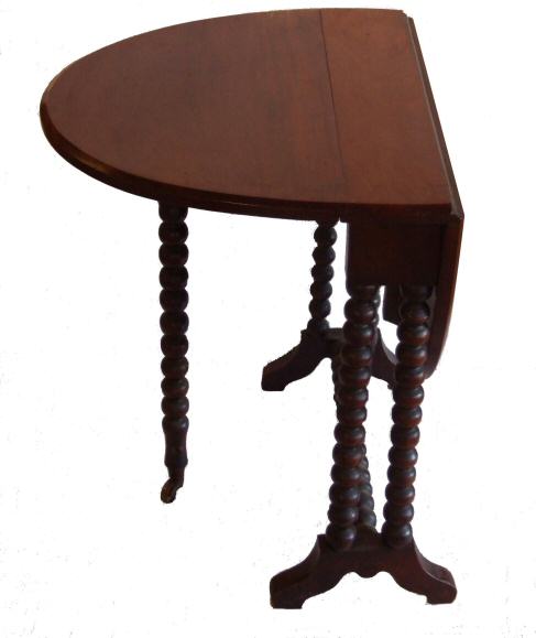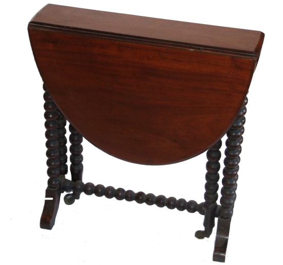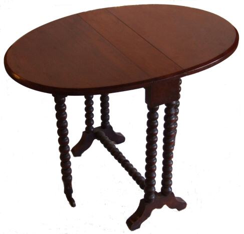 Small Victorian mahogany sutherland table A beautiful little Victorian mahogany sutherland table, the oval top with drop flaps fold down to a tiny 5" wide table which makes it so versatile and easy to find a space for. The table itself is a lovely colour and stands on bobbin legs with stretcher for extra support. A lovely little antique table. Width 5" closed, 29" open, each flap being 12" Height 20" Price £495 (Ref:Tab101) Email Us for a delivery quote : Click Here
