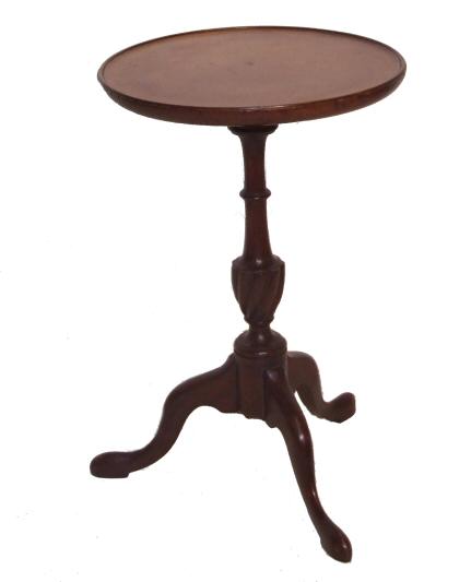 A pretty Edwardian mahogany wine table on turned stem with 3 pad feet.