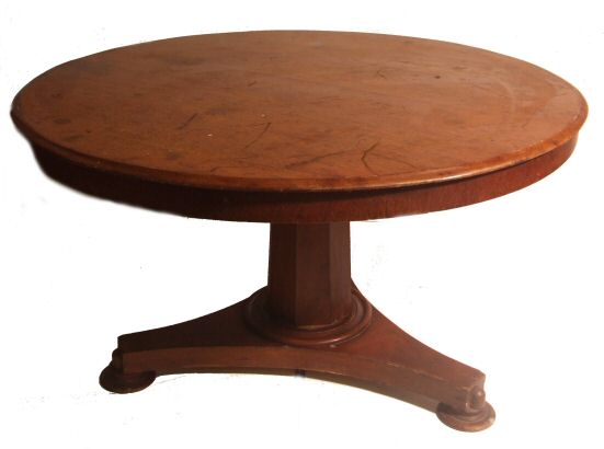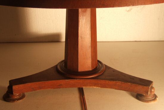 Victorian mahogany circular coffee table A beautiful Victorian mahogany circular coffee table on splay base and squat bun feet and attractive hexagonal turned stem, (originally this was a dining table but has been cut down and now forms a lovely coffee table). Photos are prework shop and more will be added once this has been french polished. H 18" W 34" £395 (Ref:TAB133) |