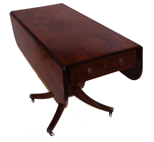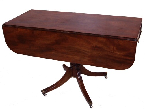 Regency Period Drop Flap Pembroke Breakfast Table Dating to early 1800, this lovely breakfast table has a superb highly figured mahogany top and is raised on a single turned pedestal with 4 beautiful outswept legs each with moulded edge to upper sides and raised on original porcelain casters with brass caps. The single drawer has a diamond escutcheon with working lock. The flaps open to allow the table to seat 4 comfortably or 6 for more intimate dining. Height 29" Width closed 20", open 42" ( each flap measuring 11") Depth 47" (Ref :TAB157) Email Us for a delivery quote : Click Here