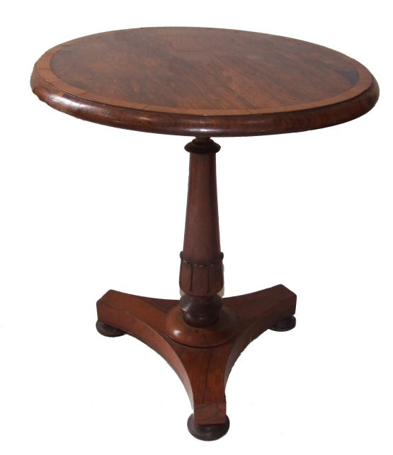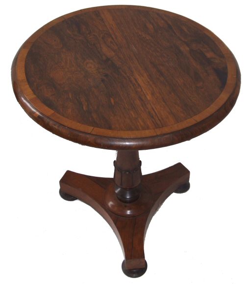 W1V Rosewood Side Table This lovely little table dates to Circa 1830-1837, and is of solid rosewood with wonderful grain to the circular top and decorative mahogany banding to the circumference, supported by trifoil base on squat bun feet with with slender stem with carved lotus leaf detailing. Width 19.75" Height 21" SOLD Email Us for a delivery quote :Click Here (Ref :TAB48)