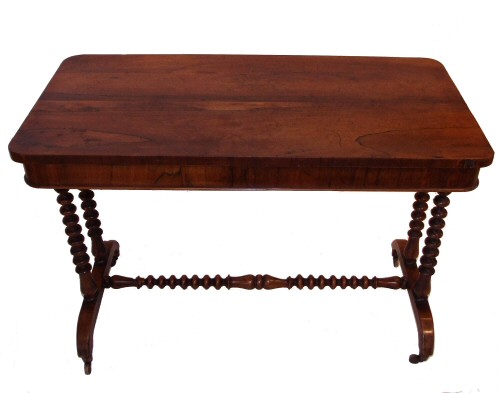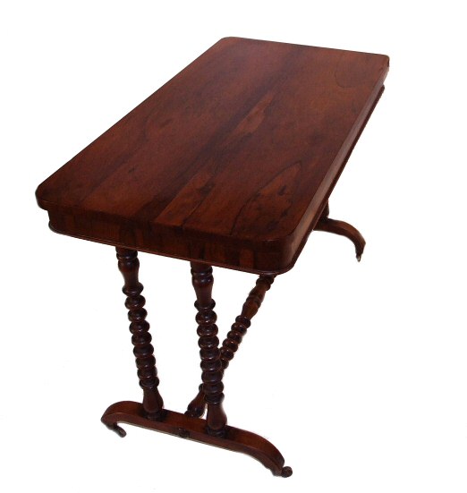 Beautiful Early Victorian Rosewood Side Table Dating to Circa 1840 this lovely highly figured rosewood side table has rosewood frieze and stands on bobbin turned legs with similar stretcher on a cheval style base with casters below. Lovely size and condition. Width 39.25" Depth 20" Height 27" PRICE £795 (Ref :TAB58) Email Us for a delivery quote : Click Here