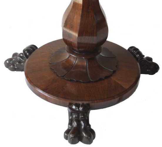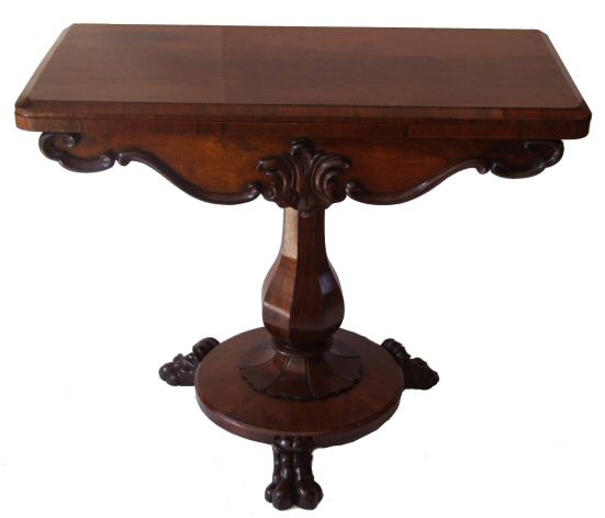 Early Victorian Rosewood Card Table A beautiful Early Victorian Rosewood card table in excellent condition. The rectangular hinged top swivels to open and reveal a claret lined interior for card playing. The top is supported on attractive lobed stem and circular base with 3 large and substantial well defined lion paw feet. Presented in beautiful condition. Height 28.5" Width 36" Depth 18" SOLD (Ref :TAB77) Email Us for a delivery quote : Click Here