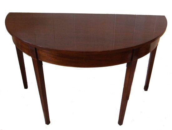 Georgian mahogany demi lune Circa 1770/1780 a Georgian mahogany demi lune standing on tapered legs, a lovely rich conker colour, the whole supported on 4 slender tapering legs with a small amount of line inlay to the frieze. Width 48" Depth 22.5" Height 29" PRICE £495