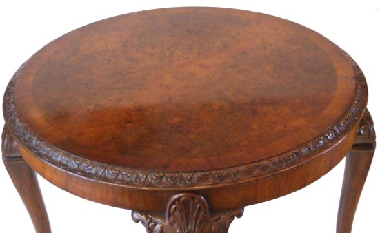 Antique Burr Walnut Coffee Tabe A beautiful round coffee table dating to Circa 1930, a lovely honey colour with gradooned edge standing on pad feet with beautifully carved detailing to the knees. Height 18.5" Width 26.5"
