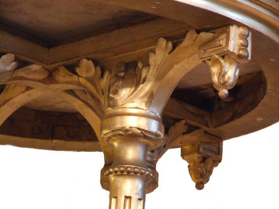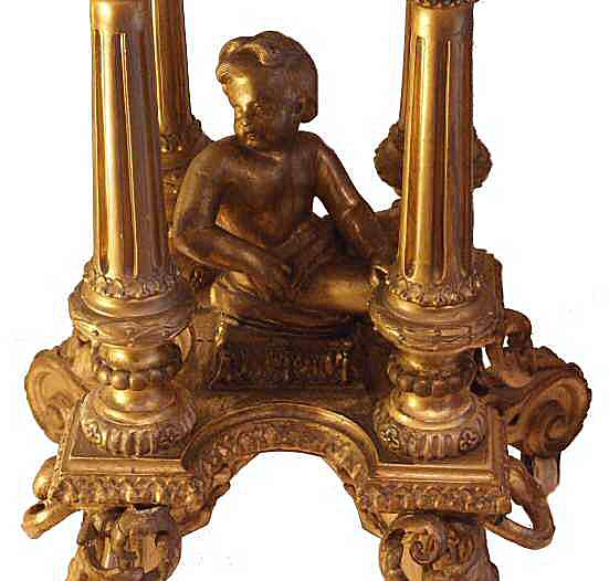 Victorian Gilt Centre Table with marble inset Circa mid 19th Century this stunning and highly unusual decorative table comprises of 4 outswept legs with large scrolling accanthus leaf decoration in relief leading into a 4 splay platform with turned and fluted pillasters above. The platform having beautifully detailed relief edging and further scrolling accanthus leaf protrusions. The pillasters rise to support a circular top each pillaster featuring superb accanthus leaf capitals. The top itself featuring a white marble inset.This high quality piece is truly stunning and is further enhanced by a charming seated cherub measuring some 10" tall contained between the pillasters. Beautiful rare table, not to be missed, would make a fantastic centre piece to a hall, landing or as a side table in a drawing room.