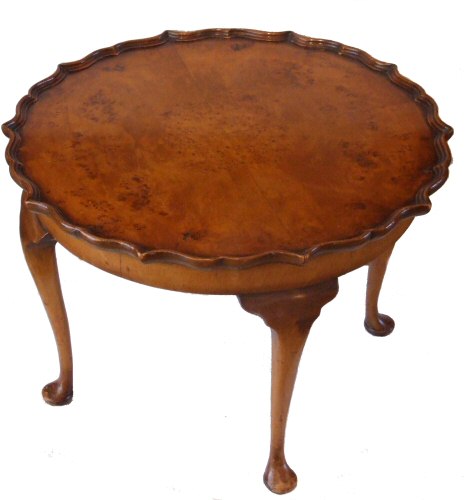 1930 Antique Burr Walnut Coffee Table Circa 1930 this attractive burr walnut coffee table stands on 3 cabriole legs with pie crust edge, the top being a lovely blonde colour and very highly figured. Height 24" Width 17.5" SOLD (Ref :TAB82) Email Us for a delivery quote :Click Here