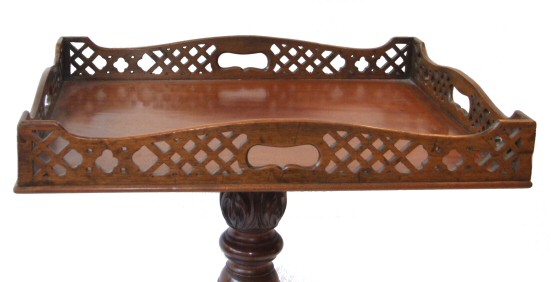 Antique Tray Top Tripod Table A beautiful antique tray top tripod table in faded mahogany. The substantial rectangular top with fretted surround supported on a carved and turned pad foot base. Would make an excellent alternative to a coffee table. Width 24" Depth 18.5" Height 26" to top of gallery £495 (Ref:TAB87) Email Us for a delivery quote : Click Here