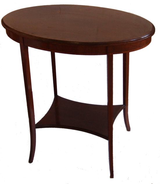 Attractive Oval Edwardian inlaid occasional table A lovely Edwardian oval mahogany occasional table with satinwood banding to the top standing on slender splayed legs with stretcher below. Good colour and size. Width 27" x 17" Height 28" Price £225 (Ref:TAB103) Email Us for a delivery quote : Click Here