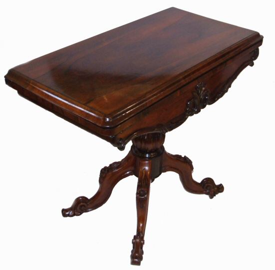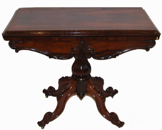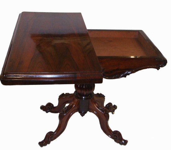 Circa 1840 An Early Victorian Rosewood Card Table Circa 1840, this early Victorian rosewood card table has a highly figured hinged top which opens to reveal a circular baize lined interior (replacement green baize). The top swivels to reveal a recess for gaming counters, cards etc, and below is a shaped frieze bordered by scrolling acanthus carving. Beneath the frieze is a beautiful finely carved vase shaped stem terminating in well defined cabriole supports with foliate carving to the knees and toes . This beautiful table stands on original small brass casters and will suit the finest of interiors. Wonderful rich colour and fantastic condition Width 36" Depth 17.75" Height 29.25" Price £1895 (Ref:TAB45) Email Us for a delivery quote : Click Here