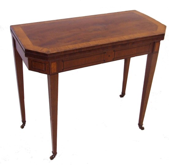 Georgian Mahogany Card Table banded in Satinwood A beautiful Georgian mahogany card table, the flamed mahogany top with thick satinwood banding (2") to its perimeter making this especially decorative and attractive. The top having canted corners opens to reveal a green baize lined interior. The whole supported on 4 slender tapering legs with original brass bucket casters. The double gate leg giving the top of this lovely table extra support and adding to its desirability. Width 35.5" Depth 17.5" Height 31" Price £1275 (Ref :TAB52) Email Us for a delivery quote : Click Here