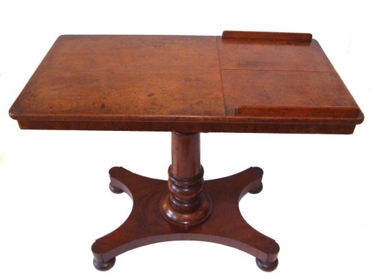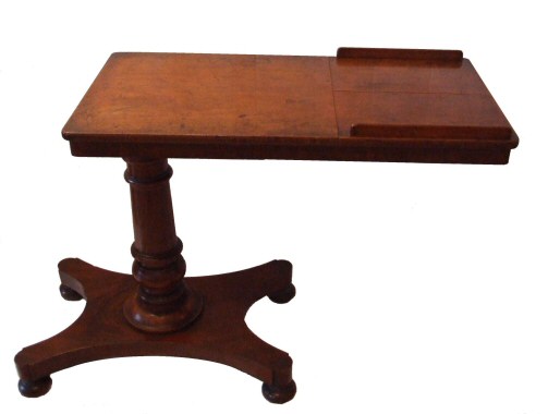 Victorian mahogany adjustable double reading stand Circa mid 19th Century a desireable and rare example of a Victorian adjustable double reading stand. This wonderful piece comprises of a 4 splay platform base veneered in flame mahogany suporting a turned central column which in turn houses a brass ratchet mechanism allowing the writing slopes to rise and fall between seating and standing position. The desk area also slides to one side allowing someone to sit with their knees under the overhang. What makes this a particularly good example is that it features a 2 sided top comprising of a pair of adjustable book rests. The whole lovely original colour and patination, the whole raised on finely turned bun feet. Ideal for use either with musical instruments or can be used for reading, desk work, large enough to take a lap top. A wonderful piece of very cleverly designed antique furniture.
