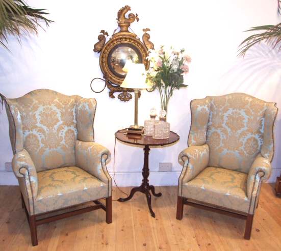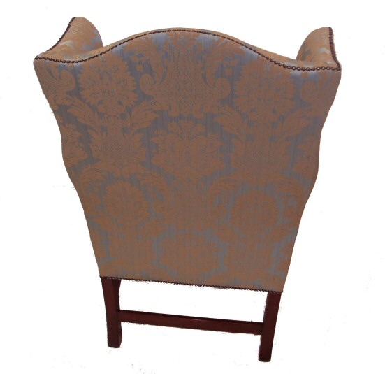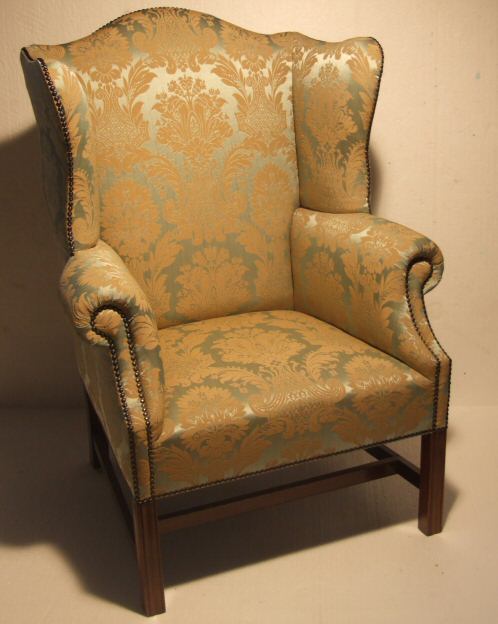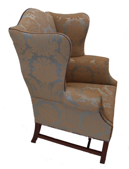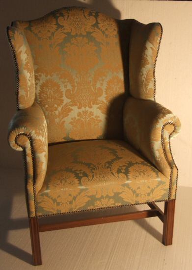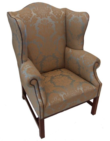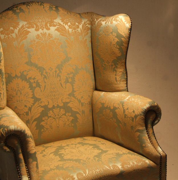 Edwardian Wing Back Armchair A beautiful Edwardian wing back armchair reupholstered from a bare frame in a stunning duck egg blue/soft green with gold accanthus detailing. The whole finished with antique coloured brass studs. A beautiful shape and style and excellent value for money. Height 44" max width 32" Price £995 (Ref:UPH112) Email Us for a delivery quote : Click Here