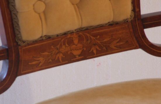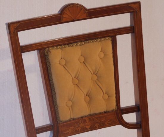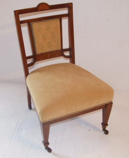 Edwardian inlaid mahogany nursing chair A pretty little Edwardian nursing chair. The mahogany frame with lovely satinwood inlay to the corners and the back covered in a soft gold material with deep buttoned back, standing on slender tapering legs and casters. Lovely condition Price £165 (Ref:UPH113) Email Us for a delivery quote : Click Here