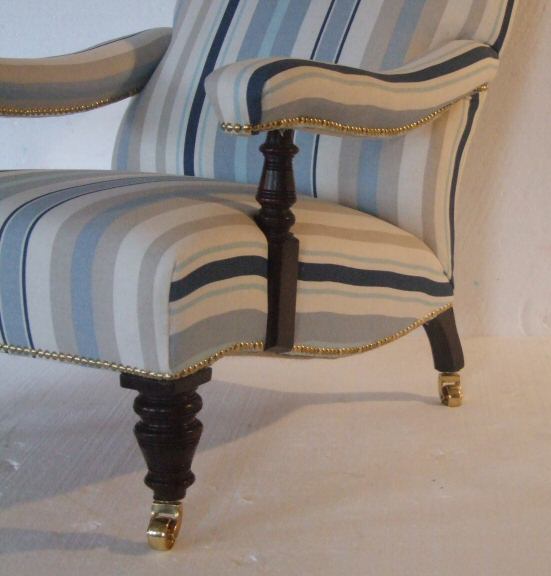 Large Low Deep Edwardian armchair A fabulous example of an Edwardian armchair which is very deep and comfortable and stands on turned legs and brass casters. The chair has been reupholstered from a bare frame and is very sturdy and is now in a Laura Ashley blue, mushroom and cream stripe finished with brass studs. The arms also padded and reupholstered add extra comfort. This is the sort of chair that will work perfectly in either a lounge or a bedroom £695 (Ref:UPH115) Email Us for a delivery quote : Click Here