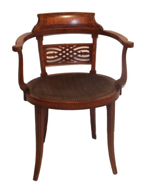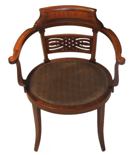 Stunning Edwardian inlaid armchair A beautiful example of an Edwardian mahogany inlaid armchair with lovely satinwood banding and decorative open fret back panel. Raised on slender inlaid legs with fabulous satinwood panel to the bar back. Now reupholstered in a stunning cream damask which enhances the beatiful show wood and satinwood detail A beautiful example in lovely condition £395 (Ref:UPH117) Email Us for a delivery quote : Click Here