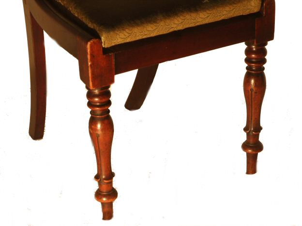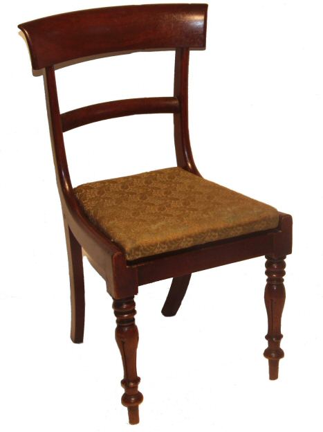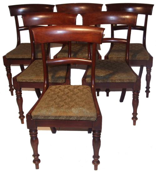 6 Victorian mahogany bar back dining chairs A lovely simple set of 6 Victorian mahogany bar back dining chairs with drop in seats (upholstered in the price), raised on slender turned legs with attractive detailing. £1695 (Ref:UPH121) Email Us for a delivery quote : Click Here