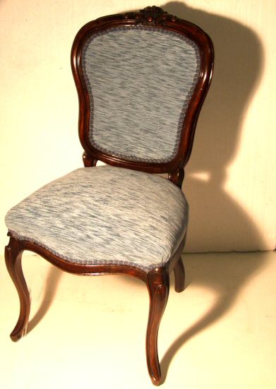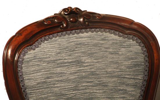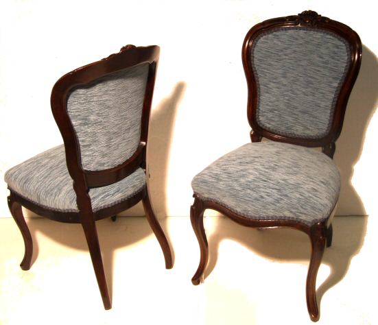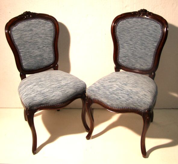 Pair of Victorian French mahogany salon chairs A beautiful pair of French Victorian mahogany salon chairs surmounted by foliate cresting to the top rail, completely re-built from bare frame in our workshops overstuffed in a soft ice blue chenille. The whole raised on cabriole supports apart from being very useable they look wonderful flanking a window or other statement piece. Stunning condition.