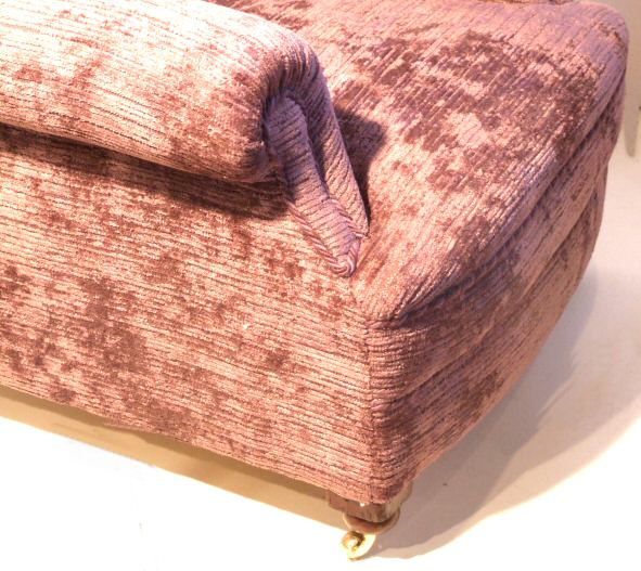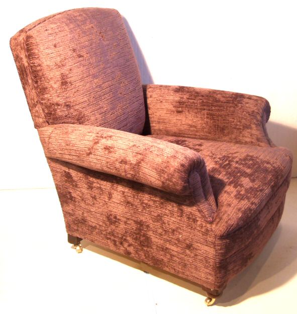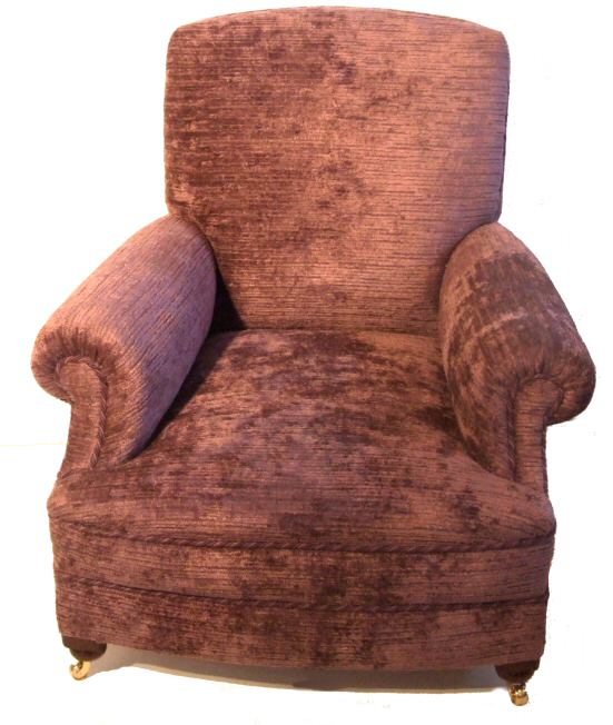 Circa 1920 deep armchair Circa 1920, a sumptuous overstuffed deep armchair re-upholstered in deep ribbed aubergine velvet with matching rope twist decoration benefitting from a newly sprung seat. The whole raised on original mahogany bun feet with new solid brass casters. A gorgeous colour, works well with antique furniture with the added benefit of being extremely comfortable. Stunning condition. £695 (Ref:UPH123) Email Us for a delivery quote : Click Here
