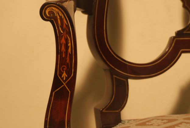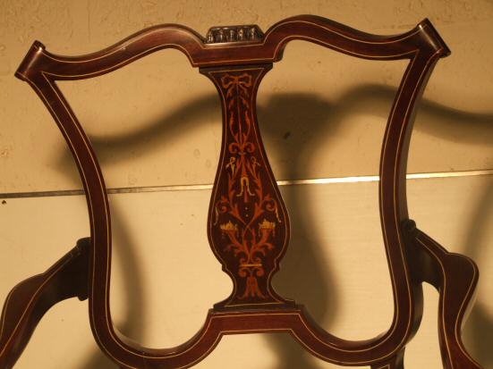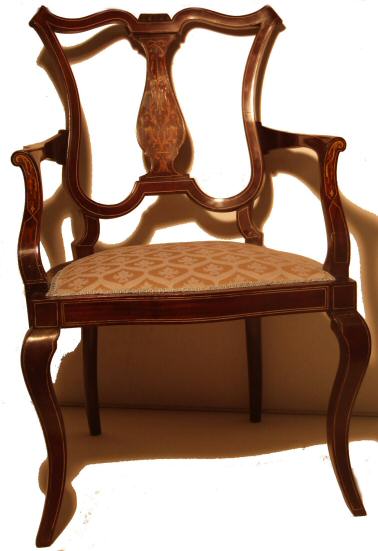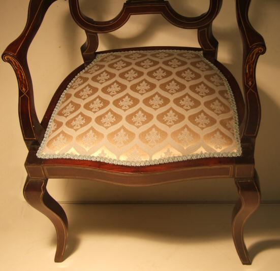 Stunning Edwardian inlaid armchair A beautiful example of an Edwardian mahogany inlaid armchair with cabriole legs and line inlay. The central motif being especially attractive in ambers, pale green and white depicting ribbon swags and foliate relief work. This lovely chair has been recovered in an egg shell blue damask and is in lovely condition and ready to use. £395 (Ref:UPH124) Email Us for a delivery quote : Click Here