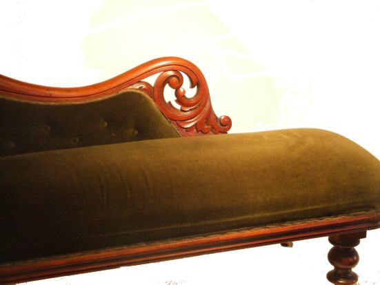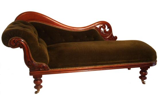 Victorian chaise longue A beautiful Victorian chaise longue, the mahogany frame has lovely accanthus detailing to the curved arm which again can be found on the beautiful scrolling arm. The whole is raised on turned legs with brass castors. This particular chaise has not yet passed through our workshops and will be delivered having been thoroughly checked and clamped as necessary, the whole will be traditionally reupholstered, if you are quick you are welcome to direct us in the choice of material to be used for the top cover. Beautiful elegant classic design. £1,895 (Ref:UPH145) Email Us for a delivery quote :Click Here
