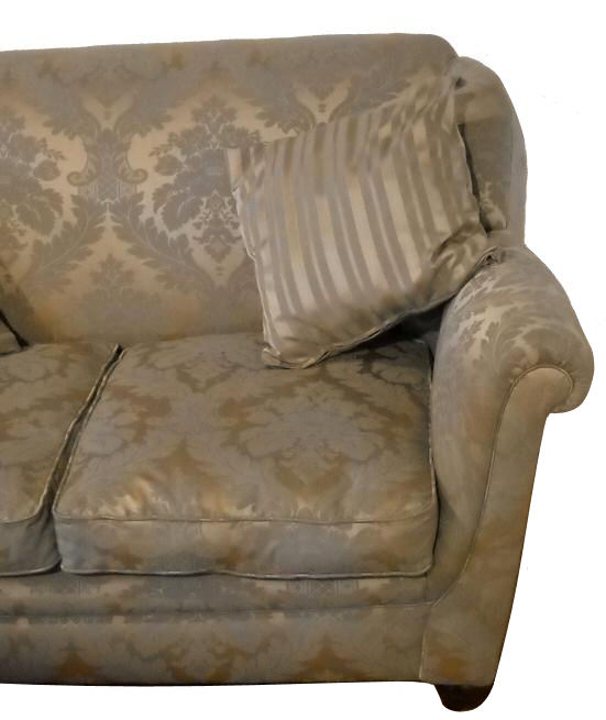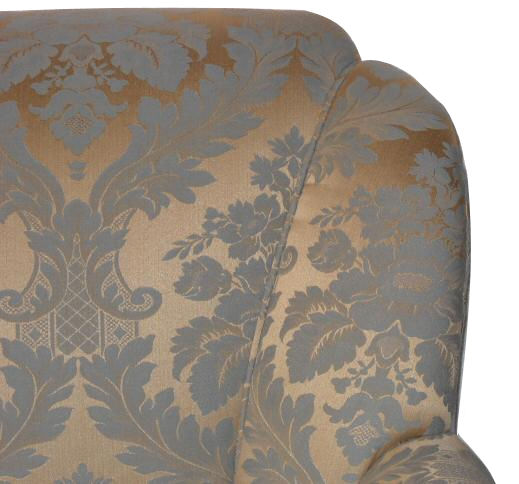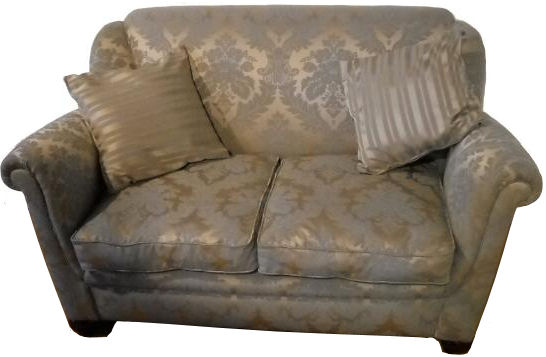 Elegant 1920s 2 seater settee This beautiful 2 seater settee has been reupholstered in duck egg damask with co-ordinating duck egg striped cushions. The whole raised on mahogany bun feet. In lovely condition this is an extremely comfy and beautiful settee. Width 60" Height 32"