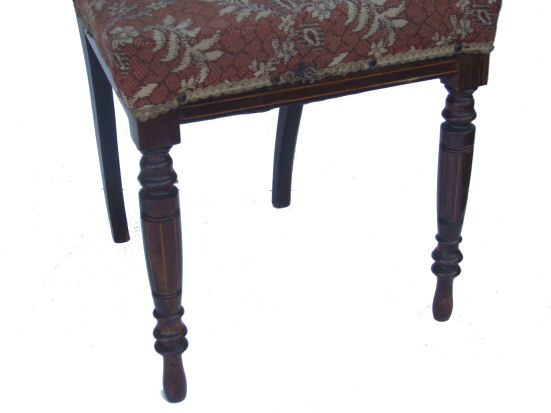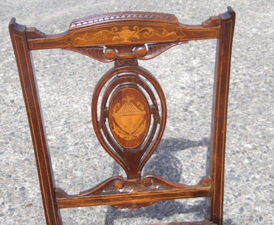 Edwardian inlaid side chair A beautiful Edwardian inlaid side chair, perfect for use with a desk or dressing table. The overstuff seat will be reupholstered included in the price. The back has lovely satinwood marquetry to the central panel in the form of an urn and satinwood inlay to the back rest and legs. A lovely ornate example. £195 (Ref:UPH172) Email Us for a delivery quote : Click Here