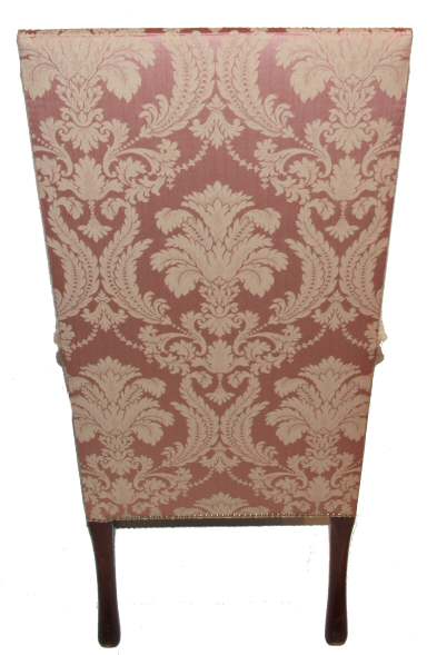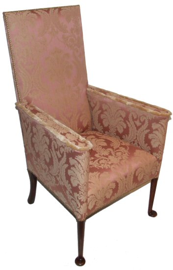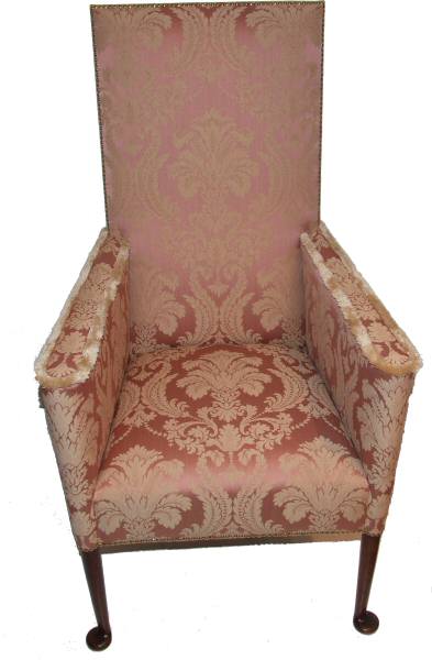 A beautiful and extremely capacious high back Edwardian armchair in the style of 1720, the newly sprung seat and back make this very supportive. The pale pink damask material is outlined by brass studs, the whole supported on solid mahogany pad feet and slender legs. Extremely comfortable and very elegant antique armchair. Height 47" Width 24" Price £1295 (Ref:UPH72) Email Us for a delivery quote : Click Here