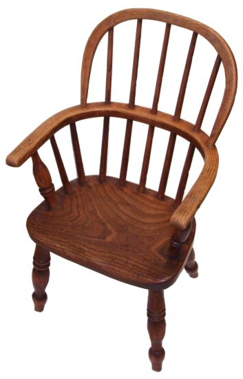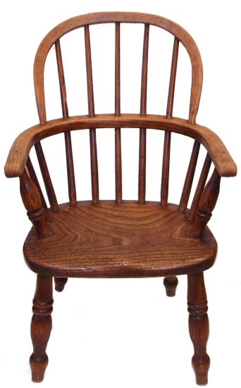 Victorian antique childs windsor chair A beautiful childs windsor chair dating to Circa 1880 has attractive spindle back and curved arms supported on turned legs with lovely grain on the seat. Height 26" of back Height of seat 12" Width 16"