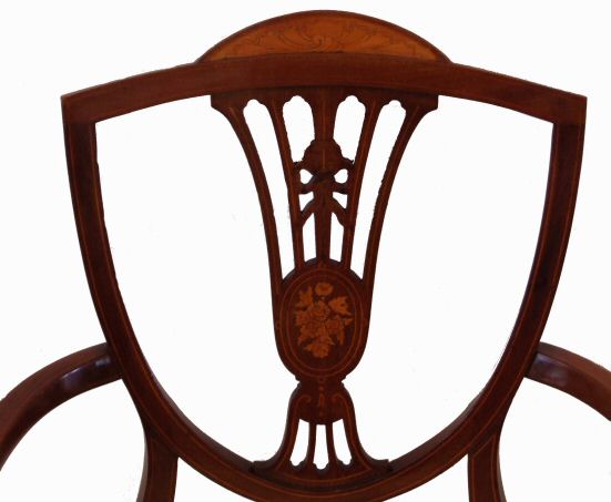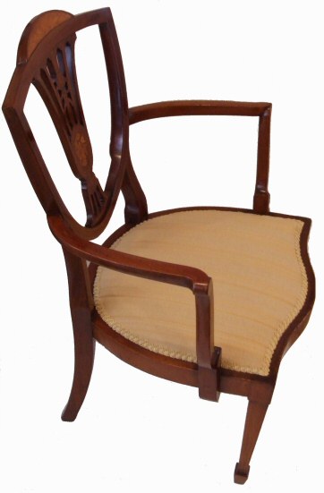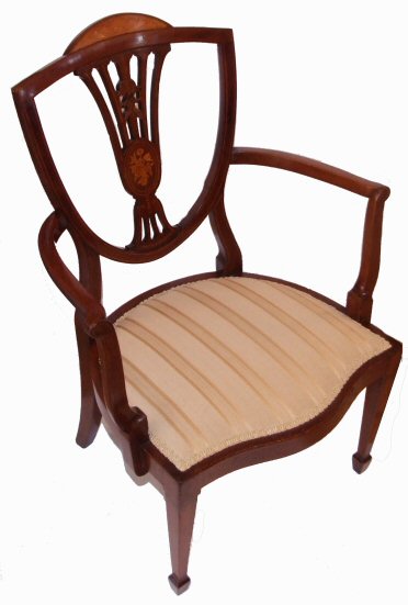 Edwardian inlaid nursing armchair A beautiful example of a mahogany inlaid nursing armchair, with beautiful satinwood inlay to the top panel in the form of acanthus detailing with central floral satinwood panel. This lovely example has been reupholstered in a regency gold stripe and is in lovely condition. Height 33" total seat height 13.5" depth 19"