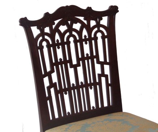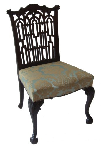 A 19th Century Chippendale Revival Gothic mahogany side chair A stunning 19th Century Chippendale Revival Gothic side chair of high quality. The whole of solid construction, a beautiful mahogany frame with Gothic design to the back, raised on cabriole legs with carved accanthus detailing to the knees and scrolling feet. Joints all checked and clamped as necessary prior to traditionally waxing and reupholstering in a beautiful duck egg damask with gold accanthus detailing accented with close nailing to the borders. Stunning Height 38" Width 22" max seat height 19" £395 Email Us for a delivery quote :Click Here (Ref :UPH87)