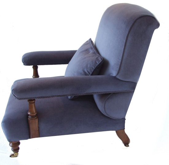 Edwardian armchair A lovely comfortable Edwardian armchair, the deep seat supported by turned mahogany legs and brass casters having turned mahogany supports to the arms. Having been recently reupholstered in a light blue velvet with piping to the back and matching cushion. Representing excellent value for money at £495 Total height 32" Seat height 12" Depth of seat 21" Price £495