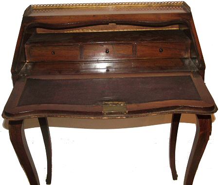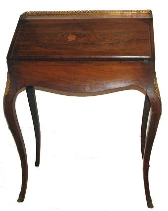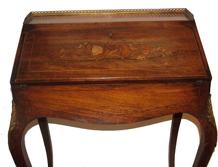 Circa 1880, an English Victorian Bureau de dame of French influence. This rosewood example has mellowed to a very attractive honey