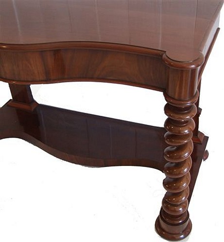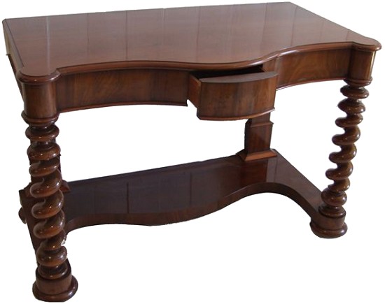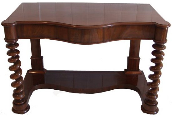 Circa Mid 19th Century, a fine Victorian figured mahogany side/console table A beatuiful example with a serpentine shaped top and small central drawer standing above large barley twist supports and a shelved undertier. This is both beautiful and unusual and is in excellent original condition. Fanstastic for use in a dining room as a serving table or in the hallway as a console table. Width 47" Depth 23" Height 32" Price £1495 (Ref : D48) Email Us for a delivery quote : Click Here