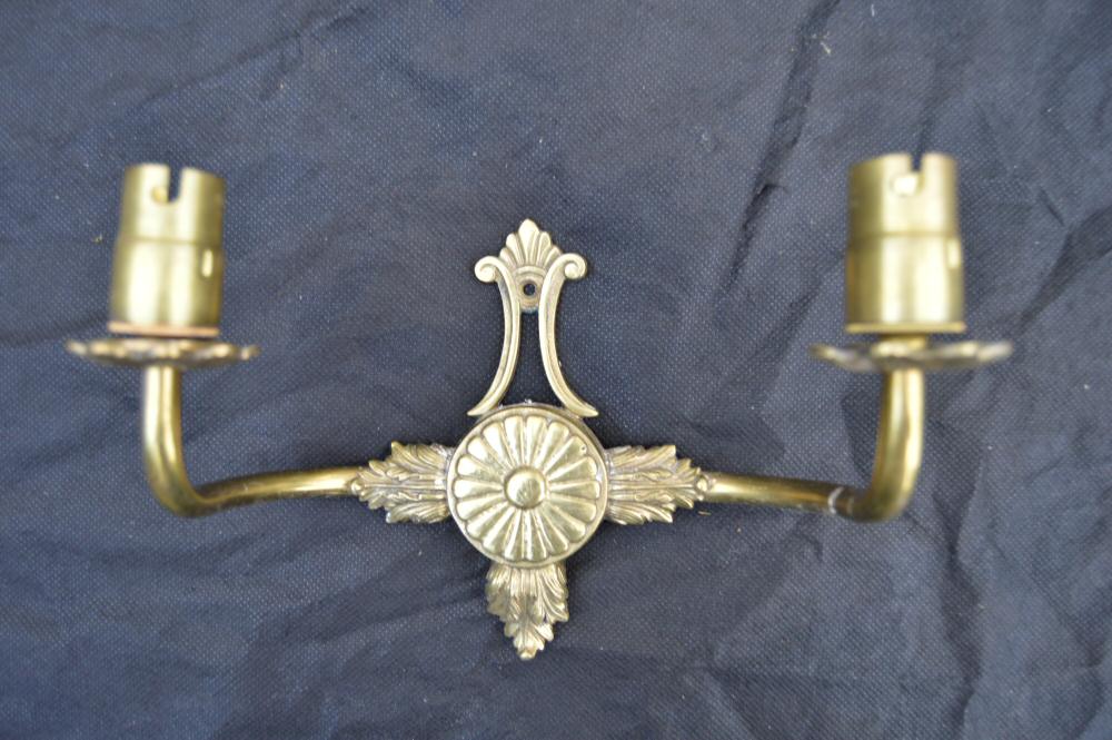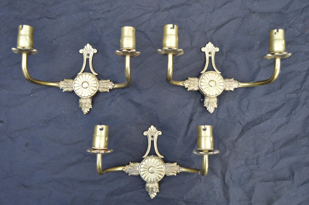 A good set of 3 brass wall lights in the Regency Style with double arms and central floral motif with accanthus leafs to either side and top and bottom. Simple and elegant and unusual to find as a set of 3.