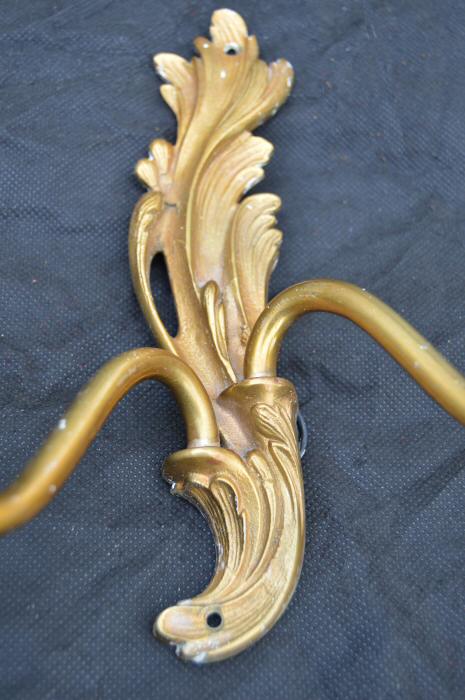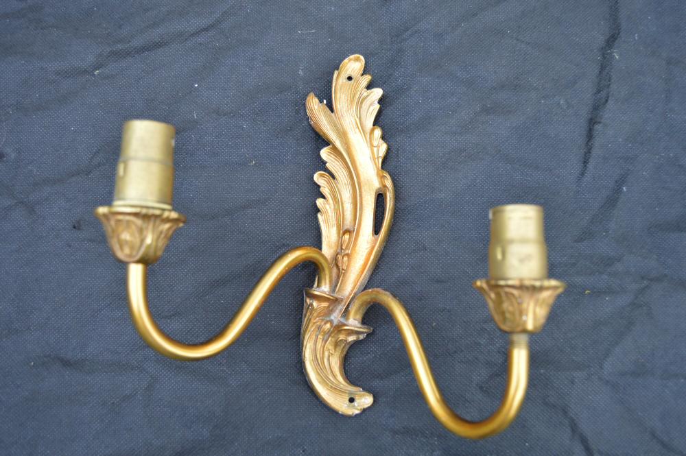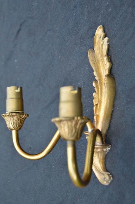 A Set of 3 Double Arm Cast Brass Roccoco Style Wall Lights Beautiful set of 3 matching double arm cast brass wall lights, dating to Mid 20th Century. The back plates have beautiful detail of swirling accanthus leaf and are simple to fix to the wall via a screw top and bottom. The arms are slender and elegant with brass candle holders. These lights will be rewired and ready to install by a qualified electrician