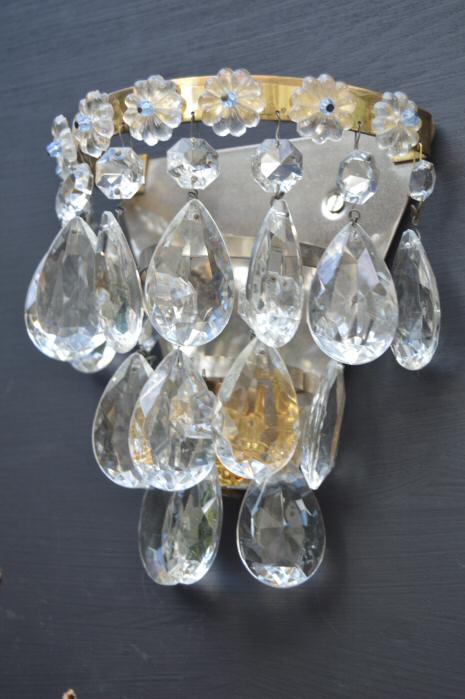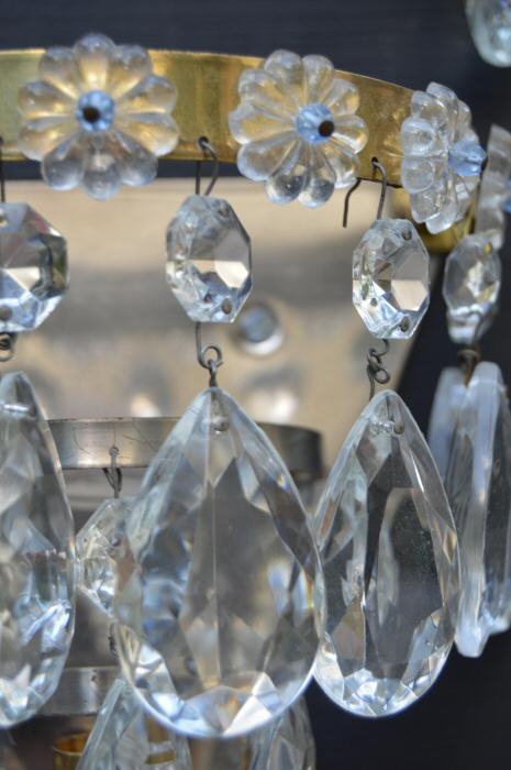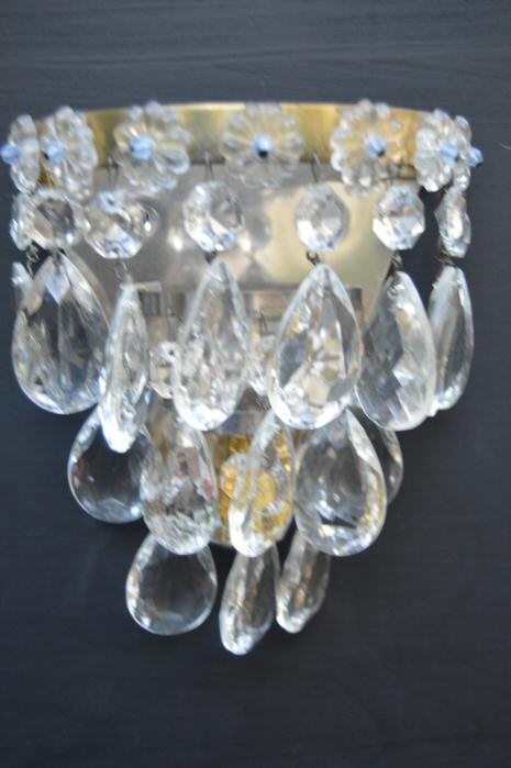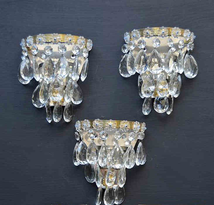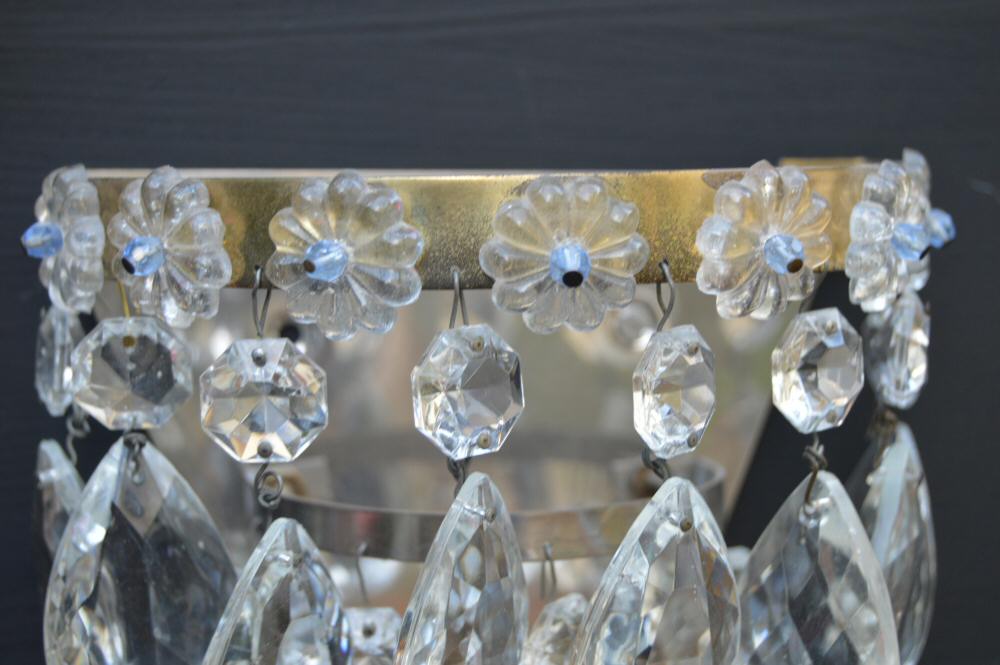 A Set of 3 Demi Lune Almond Drop Wall Lights Circa 1930, this lovely simple set of 3 matching wall lights have 3 rows or faceted almond drops (each drop measuring 2"). The frame is a pretty brass frame wimple and uncomplicated with 7 glass flowers with blue centres. The chrome backs make these extremely reflective and they are fitted with brass bayonets.These are very easy to fit flush to a wall via 2 screws through the back of the chrome plate. They will be rewired and ready to install by a qualified electrician. Height of backplate 6" Width 6" Ref WALL160 £300 Delivery £10