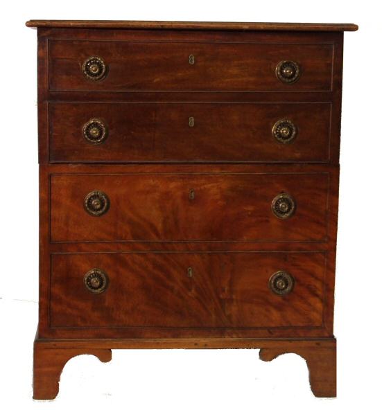 Small Regency Chest of Drawers converted for use as TV/DVD storage A beautiful little Regency mahogany chest of drawers with 2 sets of faux drawers hinged at the left side with brass drop handles standing on bracket feet. Highly figured drawer fronts of rich conker colour. This lovely chest is a gorgeous size and very practical, can be used as a bedside cabinet or for TV and DVD storage in a lounge or bedroom. Beautiful. Further photos once this has passed through our workshops. Height 29" Width 25" Depth 17.5" Price £995 Email Us for a delivery quote :Click Here (Ref :BED505)