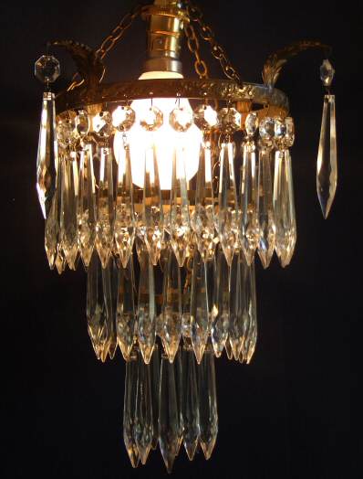 Attractive 3 tier "icicle" drop antique chandelier Dating to the early part of the 20th Century this attractive antique chandelier has 3 tiers of sparkeling "icicle" drops dressing the elegant gilt frame with 3 acanthus leafs and further drops adorning these. Height 15" minimum plus chain Width 10" pus leafs rewired and ready to install Price £275 (Ref : CHA101) Email Us for a delivery quote : Click Here