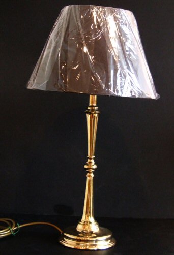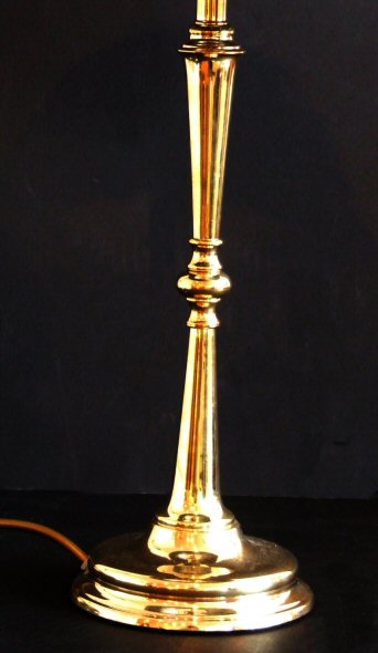 Slender waisted antique brass table lamp A pretty slim waisted antique brass table lamp supported on a circular stepped base. Simple and elegant in design. Photographed with a new chocolate brown shade which can be changed for a different colour if not to your taste. Height 18." to top of shade Base 5" Price £125.00 (Ref : CHA145) Email Us for a delivery quote : Click Here