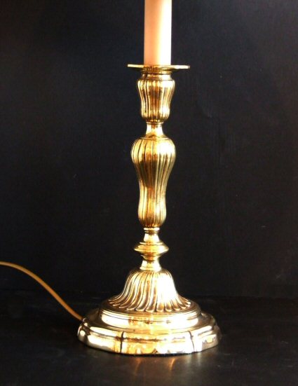 Large Attractive Edwardian Brass Table Lamp Very striking in design this substantial antique brass table sits on large circular serated stepped base with shapely reeded stem terminating in candle holder with cream shade (new). Rewired and ready to grace your home. Height 22.5" to top of shade Base 6" Price £149.00 (Ref : CHA150) Email Us for a delivery quote : Click Here