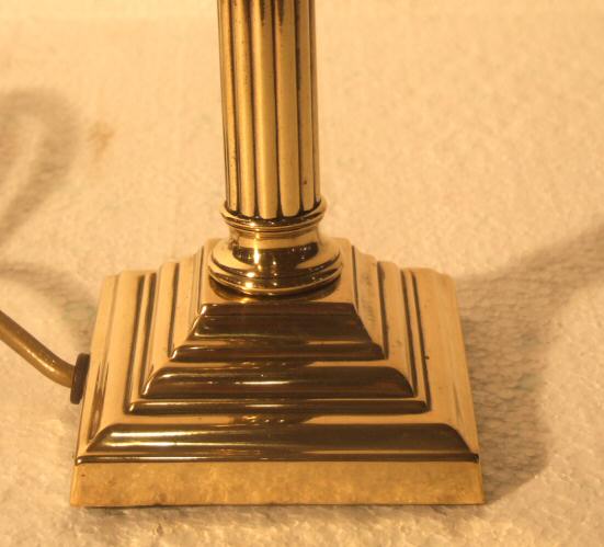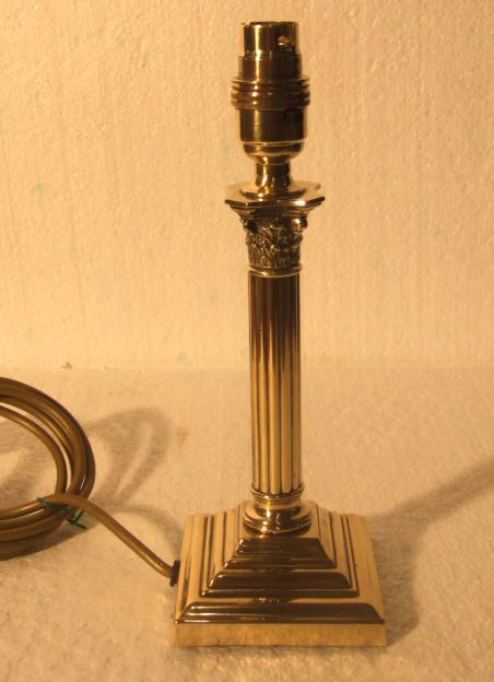 Beautiful small Edwardian Corinthian column brass table lamp An attractive small Edwardian Corinthian column brass table lamp with reeded circular stem raised on a stepped base with acanthus detailing to the top. Price includes a new cream shade and comes rewired and ready to use. Height 10" plus shade Width of base 3.5" Price £165 (Ref:CHA608) |