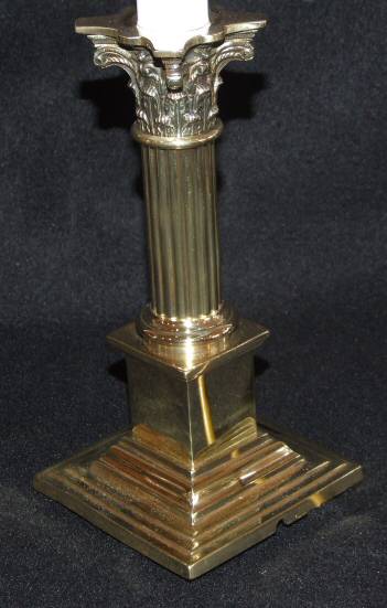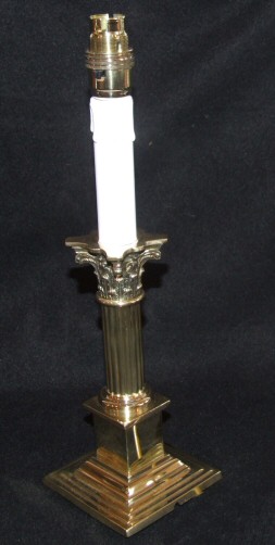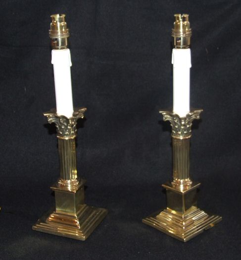 Beautiful pair of antique brass table lamps These lovely pair of antique brass table lamps were originally candle sticks, but have been converted to table lamps. The square stepped base supports the short circular reeded stem and acanthus capital which in turn supports a candle holder and the brass bayonet. These lovely lights certainly make a feature and come fully rewired with silk flex. Height 14" to top of bayonet Base 4" Price £295 the pair (Ref : CHA66) Email Us for a delivery quote : Click Here