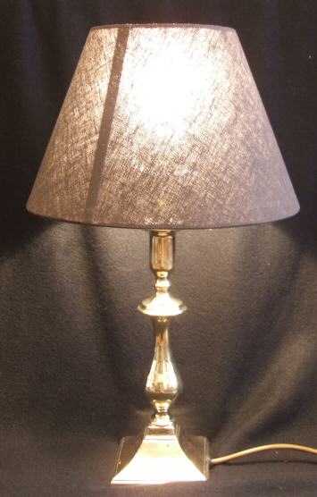 Antique brass table lamp A beautifully simple petite little table lamp in solid brass, It features a stepped square base with vase shaped stem. Rewired with silk flex and inclusive of new chocolate coloured shade. Height 17" to top of shade Base 4" Price £95.00 (Ref : CHA68) Email Us for a delivery quote : Click Here
