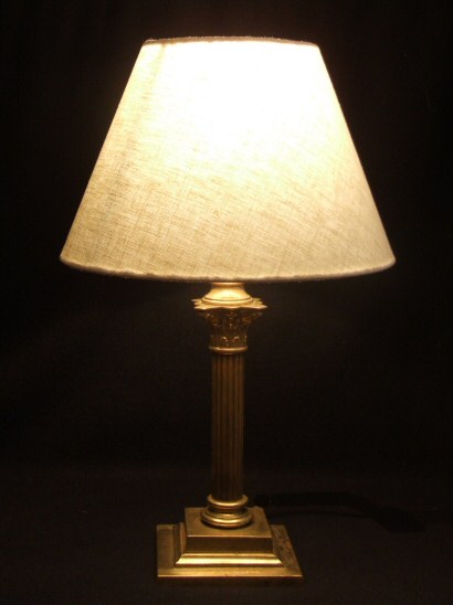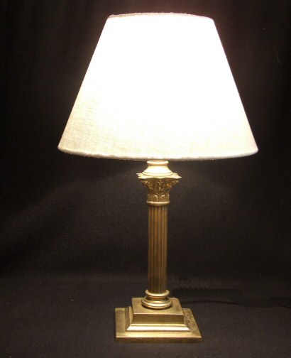 Circa 1900 an antique Brass Corinthian Column Table Lamp A classically designed brass antique table lamp of small proportions. This Corinthian column example has a square stepped base with circular fluted stem terminating with acanthus capital. Rewired with silk flex. Beautiful condition. Height 16" to top of shade Base 4.5"