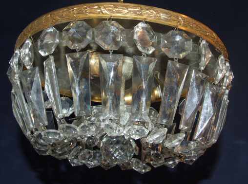 Lovely small purse chandelier Ideal for low ceilings this lovely purse chandelier with gilt frame is of bag construction. The rectangular and hexagonal drops are faceted and held in place by ribbed glass dish terminating in a faceted ball. Width 10" Height 6" plus chain SOLD (Ref: CHA76)