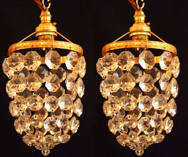 A petite pair of antique purse chandeliers Dating to the early part of the 20th Century these lovely small single bulb chandeliers are an exact matching pair and ideal for a cosy cottage or those areas that are small and tricky to light. Attractive gilt frames with hexagonal glass drops terminating in a small glass rosette to form a bag. Rewired and ready to hang Height 9" Width 4.5" Price £185 the pair (Ref : CHA96) Email Us for a delivery quote : Click Here