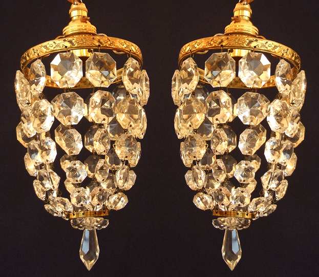 A petite pair of antique purse chandeliers Dating to the early part of the 20th Century these lovely small single bulb chandeliers are an exact matching pair and ideal for a cosy cottage or those areas that are small and tricky to light. Attractive brass frames with hexagonal glass drops terminating in a small brass rim with glass flower which holds the strings to glass drops to form a bag. These are beautiful lights which sparkle all the colours of the rainbow. Rewired and ready to hang Height 10" Width 4.5" SOLD (Ref : CHA97) Email Us for a delivery quote : Click Here